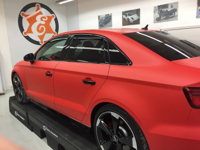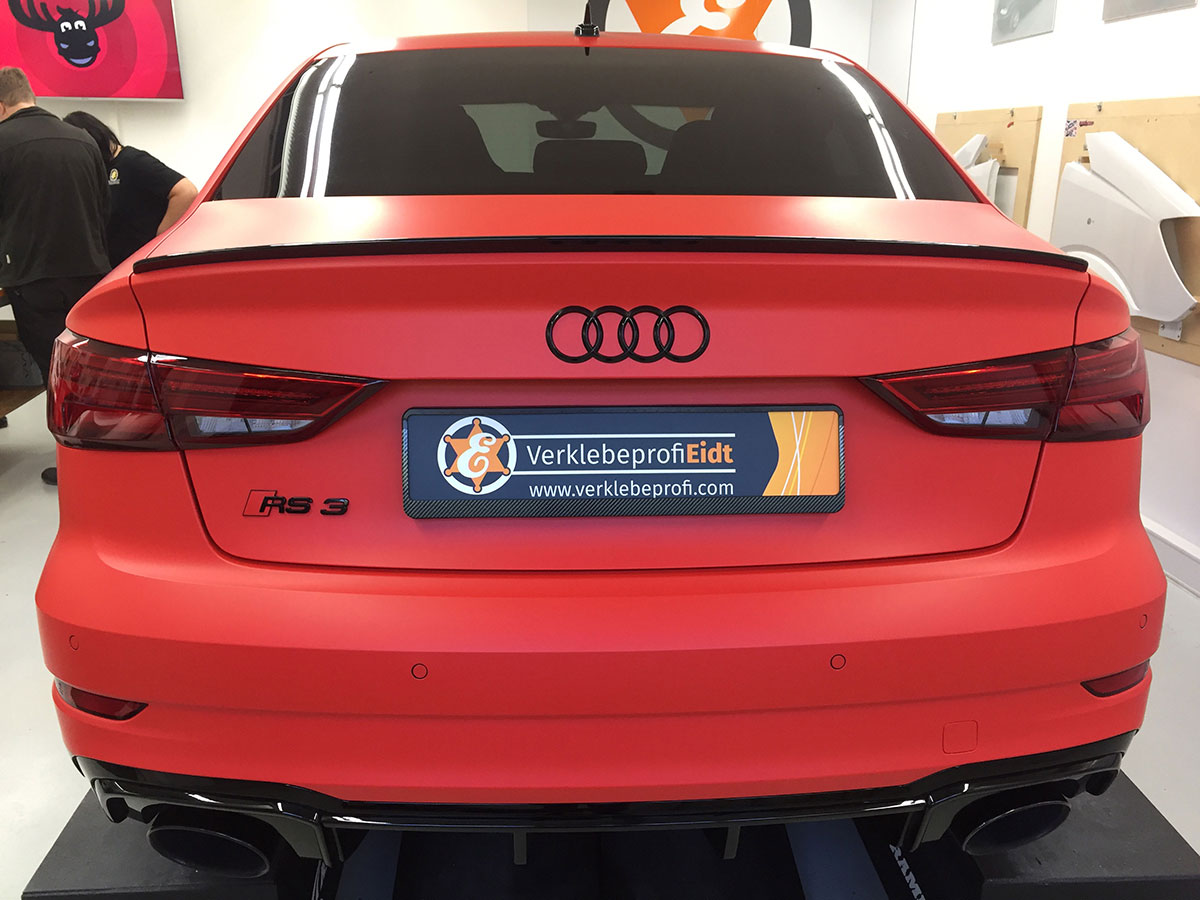 Diese Audi RS3 Limousine wurde von uns in einem matten Rot foliert mit zahlreichen Akzenten in Schwarz glänzend. Als Folie haben wir uns für die 3M 2080 Serie entschieden.