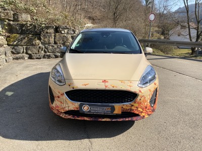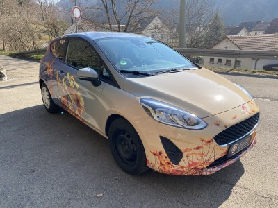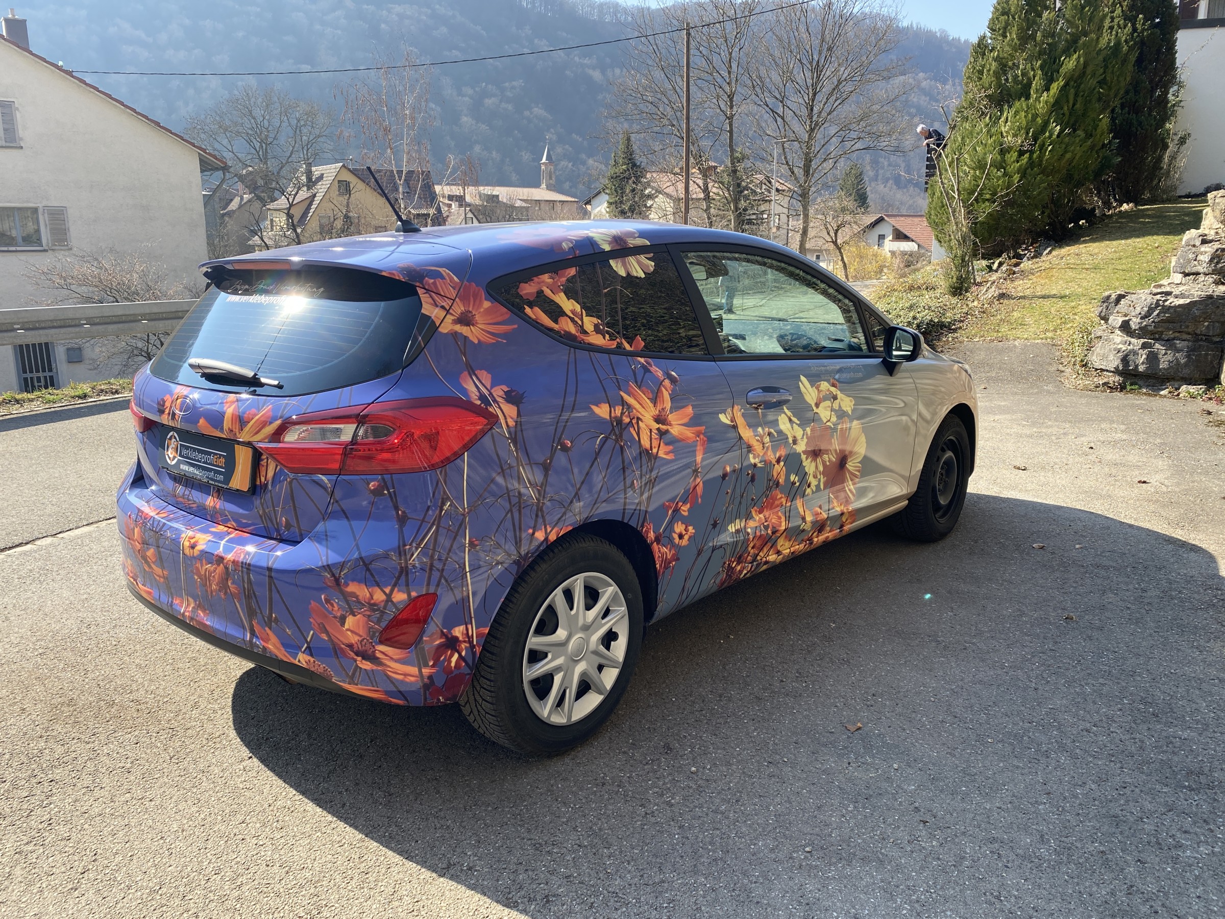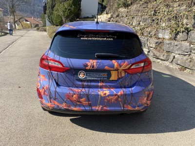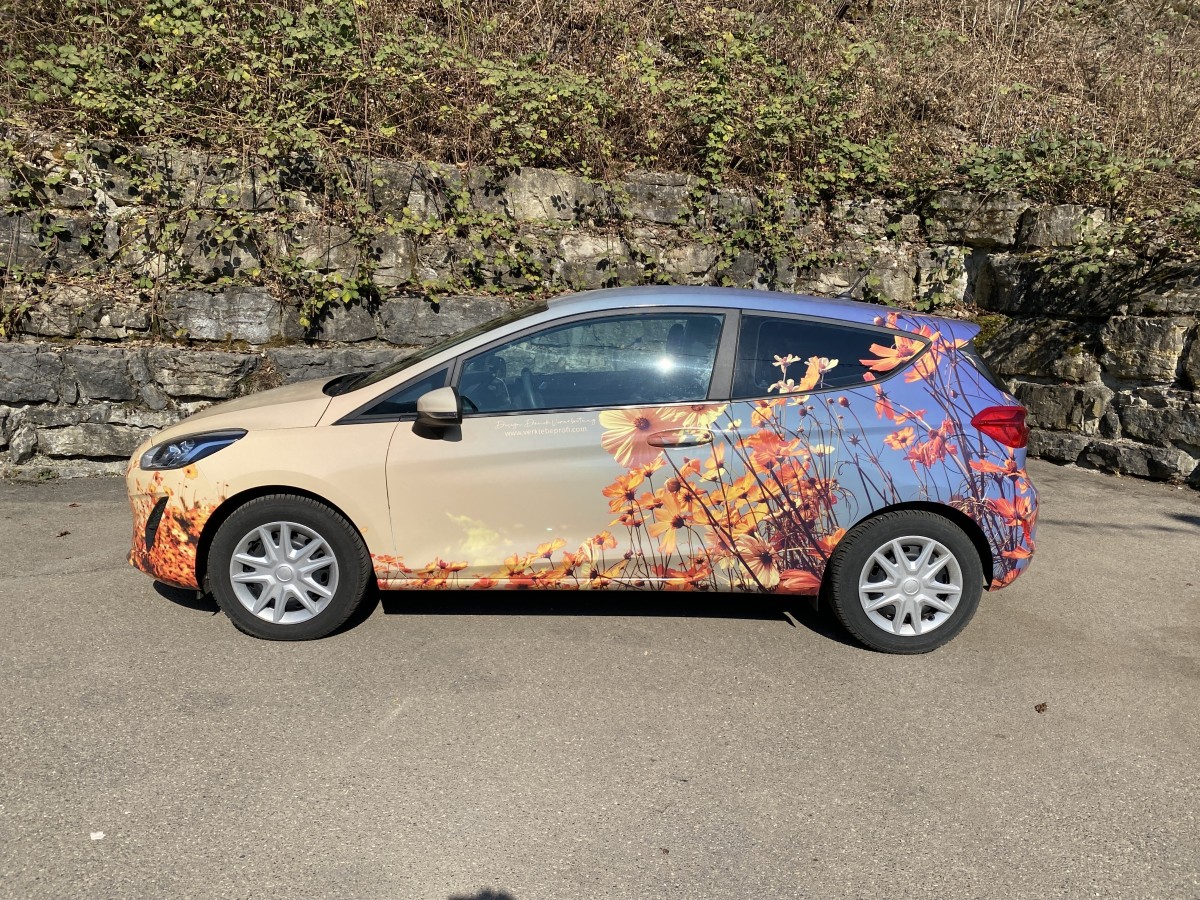 Unser kleinster Firmenwagen, ein Ford Fiesta, erstrahlt in einer neuen Vollverklebung. Von dem ersten Entwurf am Rechner, über den 6-Farb Digitaldruck und das Verlegen der Folie machen wir alles im Haus. Unser Fahrzeug erscheint in einem Meer von Blumen im Sonnenuntergang. Die auffällige Gestaltung hat uns bereits zahlreiche Komplimente eingebracht und verleiht unserem Wagen einen einzigartigen, unverwechselbaren Look.
